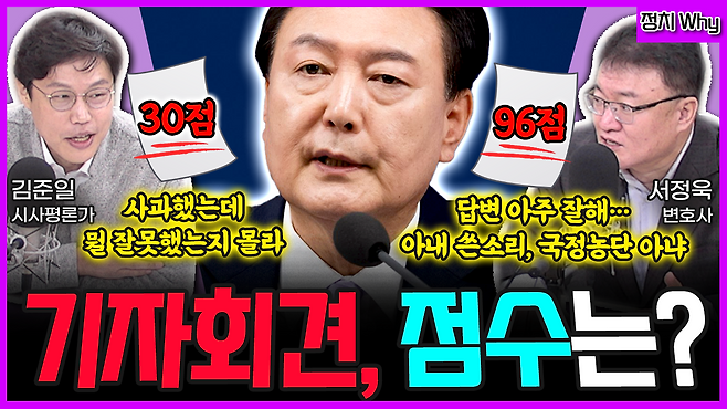 ▶ 김준일 : 96점에서 충격먹었습니다. 아니, 원래 사람이 좀 다 다르기는 하지만 이렇게까지 다를 수가 있구나. 저는 한 30점 정도 드릴게요. 30점을 드린 이유는 사과를 했다. 대통령한테 사과받으려고 하는 게 아니라 본인이 잘못한 게 있으면 사과를 하는 게 당연한 건데 이렇게 힘든가. 제가 뭐 우리 서정욱 변호사님이 더 용산의 분위기는 잘 아시겠지만 제가 듣기로는 용산 참모들이 사과해야 된다, 사과라는 표현을 써야 된다라고 강력하게 얘기를 했다는 거예요. 예전에 엑스포 유치 실패했을 때 그때는 죄송하다는 마음이 든다, 다 제 불찰이다라고 얘기를 했어요. 그런데 사과라는 표현을 안 썼기 때문에 처음으로 사과라는 표현을 쓰고 고개를 숙인 거 이거는 이제 아주 전략적이었다, 쉽게 얘기를 하면. 왜냐하면 이제 그 부분을 집중적으로 또 말씀하시는 분들이 서정욱 변호사님같이 이런 분들이 있기 때문에 그런 건데 쉽게 얘기를 하면 어저께 이런 이 기사의 베스트 댓글이 그런 거였어요. 뭐였냐면 ‘사과하라고 해서 하기는 하는데 뭘 잘못했는지 모르겠다.’ 이게 좋아요, 베스트 댓글로 올랐는데 본인이 마지막에 보면 부산일보 기자랑 경향신문 기자가 물어보니까 구체적으로 그럼 어떤 건지를 얘기해 달라라고 하니까 그냥 두루뭉술하게 얘기를 하잖아요. 정확하게 뭐 이렇게 얘기를 했어요. 뭐가 잘못한 거냐고 짚으면 내가 그 팩트에 대해서 얘기하고 사과를 하는데 너무 많다. 그 많은 거에 대해서 내가 어떻게 하느냐라고 하면 사람들이 이거를 진정성 있게 받아들일지 참 의문입니다.