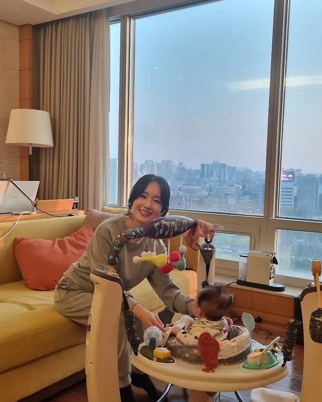 깔끔한 화이트 니트에 데님 팬츠를 매치해 캐주얼하면서도 단정한 데일리룩을 선보였고, 다른 컷에서는 편안한 그레이 트레이닝 세트를 입고 아이와 함께 시간을 보내는 모습으로 따뜻한 엄마의 모습을 드러냈다.