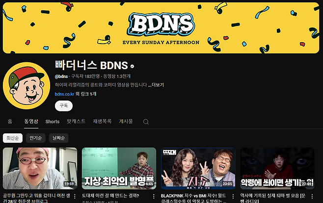 이미지 = 유튜브 ‘빠더너스 BDNS’ 채널 메인 화면 캡처 (https://www.youtube.com/@bdns/videos)