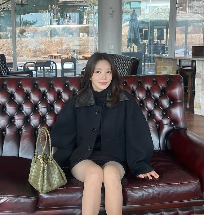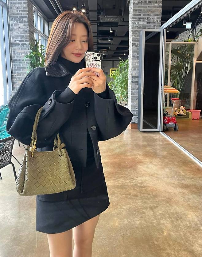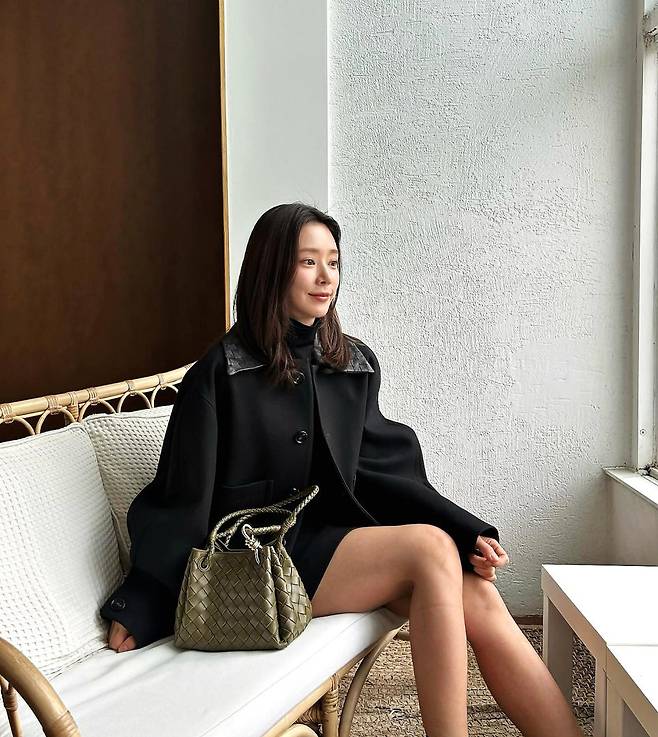 여기에 미니스커트와 롱부츠 조합으로 하체를 길어 보이게 하는 스타일링을 활용했고, 올리브 컬러의 보테가베네타 백으로 컬러 포인트를 주며 고급스러운 무드를 더했다.