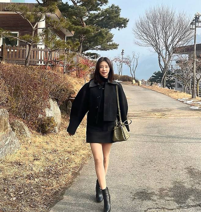 짧은 기장의 블랙 미니스커트와 무릎 위까지 올라오는 롱부츠의 조합은 하체를 길어 보이게 만들어 163cm라는 키가 전혀 작아 보이지 않게 연출됐다.