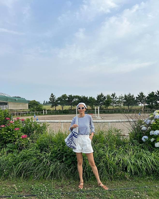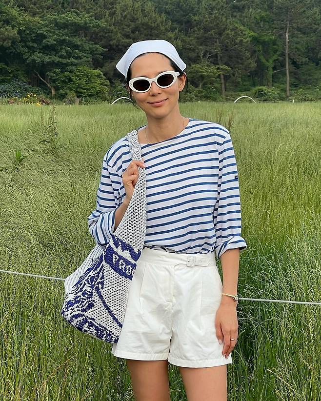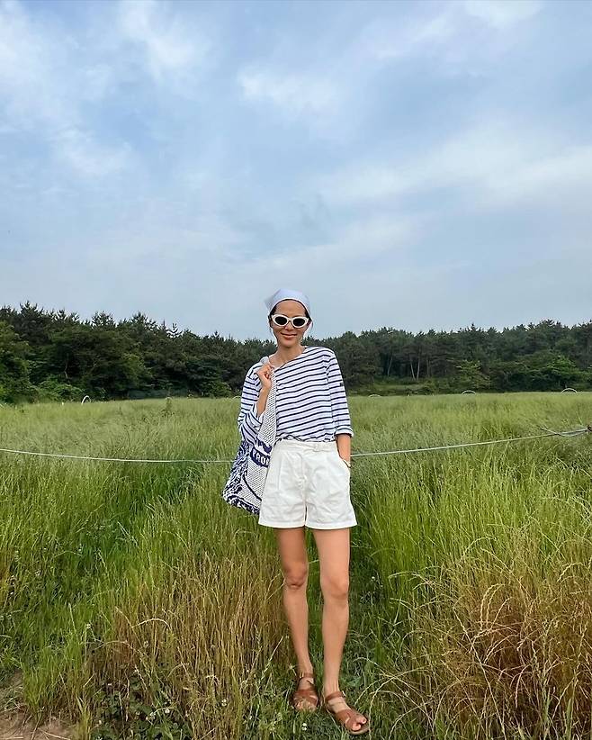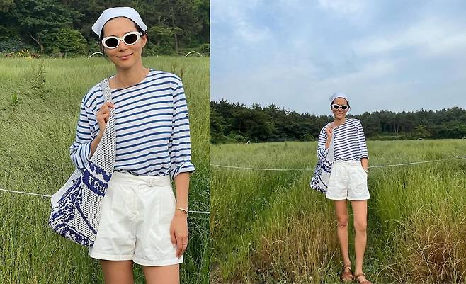 사진 속 김나영은 블루색의 스트라이프 티와 흰색 숏팬츠를 입고 두건과 선글라스를 써서 남다른 패션 감각을 선보였다.