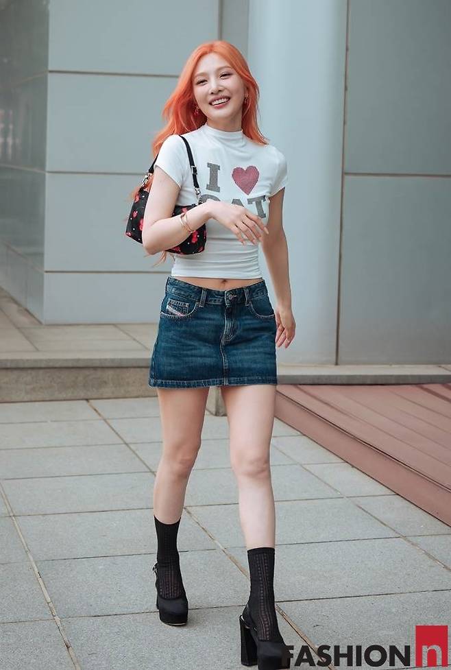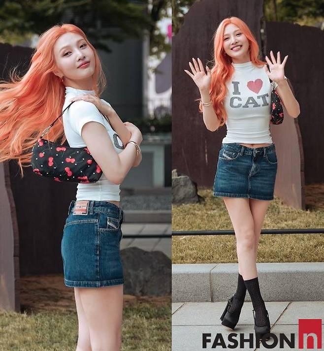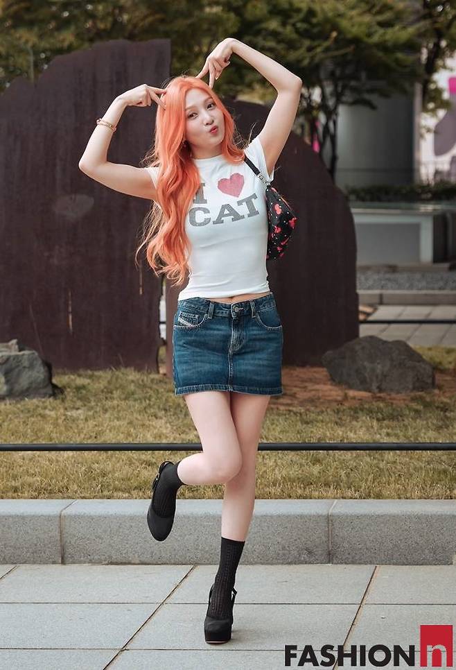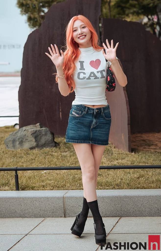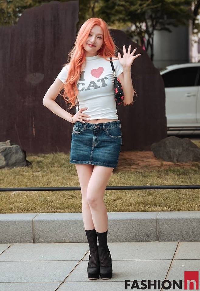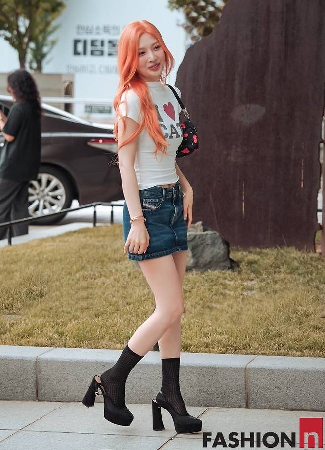 이날 조이는 빨간머리의 화려한 헤어스타일에 아이러브캣 로고가 찍한 화이트 티셔츠와 마이크로 데님 스커트를 매치한 러블리한 걸리시룩으로 시선을 강탈했다.
