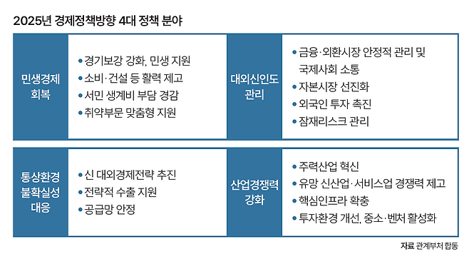 정부는 이에 따라 올해 경제의 정책 목표를 ‘대내외 불확실성 확대에 대응해 경제를 최대한 안정적으로 관리’하는 것으로 잡았습니다. 이를 위해 ▲민생경제 회복 ▲대외신인도 관리 ▲통상환경 불확실성 대응 ▲산업경쟁력 강화 등 4대 분야에 정책을 집중하기로 했습니다. 최상목 대통령 권한대행 부총리 겸 기획재정부 장관은 “정부는 우리 경제를 최대한 안정적으로 관리한다는 목표하에 ‘2025년 경제정책방향’을 마련했다”며 “무엇보다 민생경제 회복에 총력을 기울이겠다”고 밝혔습니다.