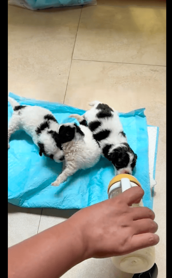 아직 어린 나이에 방치될 경우 위험했기에 아주머니는 서둘러 세 마리를 집으로 데려왔다. 갓 태어난 강아지들을 돌보기란 쉽지 않았지만, 그래도 한 달 가량 열심히 보살폈다. 개 중 한 마리는 우유를 먹다 목이 막히는 위기를 겪기도 했지만, 병원에서 제때 구조를 받을 수 있었다.