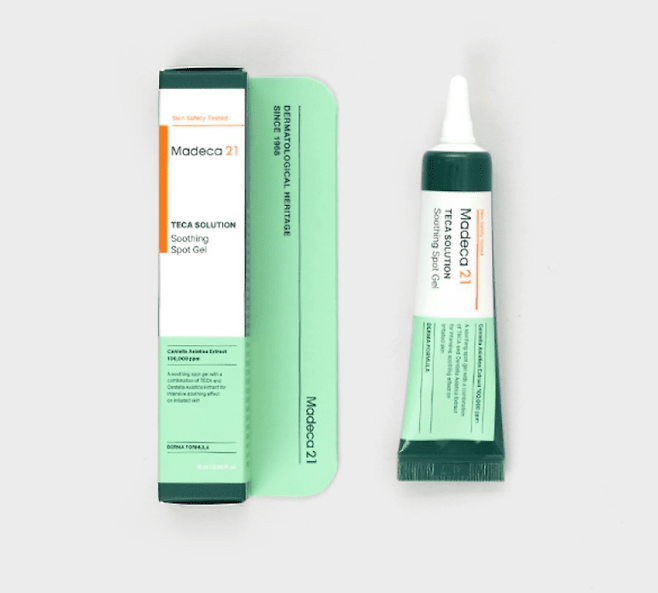 붉고 딱딱한 트러블이 났다면 '마데카21 테카솔루션 수딩 스팟젤'은 어떠세요? 진정효과에 좋은 센텔라아시아티카와 병풀 추출물이 들어 있는 제품인데요. 제약회사에서 만든 트러블 전용 화장품으로, 젤 타입으로 산뜻하면서도 끈적임 없이 쓰기 좋은 제품입니다. (3000원)