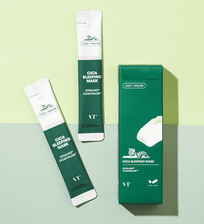 최근 제품력을 인증받고 있는 브랜드 'VT 코스메틱'의 'VT시카 슬리핑 마스크' 입니다. 6개입에 3000원으로 자작나무 수액, 쑥 추출물, 3중 히알루론산 등 7가지가 넘는 진정 성분으로 피부의 컨디션 회복을 도와주는 슬리핑 팩인데요.