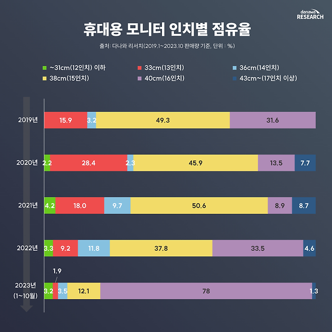 TV처럼 휴대용 모니터도 '거거익선'이 대세다. 같은 휴대용이라도 노트북은 16인치(22.6%)보다 15인치가 대세(48.4%)지만, 휴대용 모니터는 16인치(78%)가 2022년 기점으로 점유율이 급증했다. 반면 14인치 제품의 점유율(8.6%)은 2020년 이후 꾸준히 감소하고 있다.