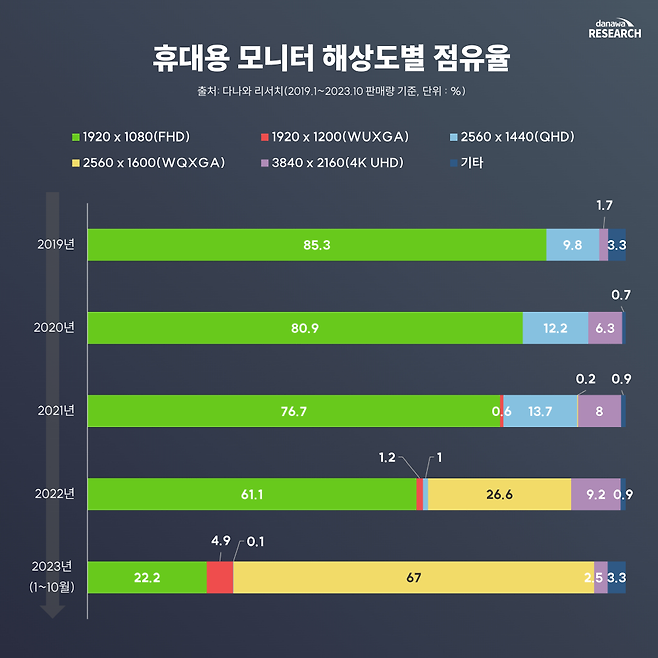단순히 화면만 커진 것이 아니다. 휴대용 모니터는 WQXGA 해상도라는 게 일종의 공식이 되었다. 전체 판매량의 대다수를 차지하는 제우스랩 제품이 결정적인 원인이다. 4K UHD는 제품 수가 많지 않고 가격대도 20만 원 이상에 휴대용 모니터가 가성비 제품 위주로 판매되는 추세다 보니 판매율이 저조했다. 참고로 휴대용 모니터 중 터치스크린을 탑재한 제품은 1~10월 전체 중 37.3%를 차지했다.