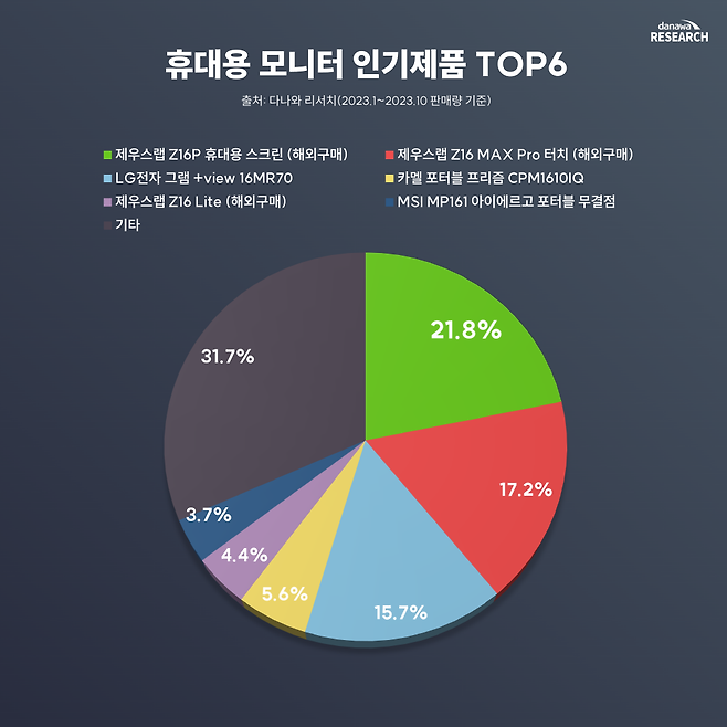 자세히 분석해 보면 휴대용 모니터의 전체 판매량을 견인한 건 해외직구 방식이었다. 지난 1월부터 10월까지, 다나와 리서치 기준 판매 제품의 절반 이상이 중국 기업인 제우스랩의 제품이다. 국내 정식 출시되지 않고 해외직구 제품이기 때문에 A/S를 받기 어렵다는 치명적인 단점에도 불구하고 워낙 가성비가 뛰어나 많은 판매고를 올린 것이다.