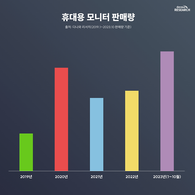 올해 휴대용 모니터 시장은 호조를 보이고 있다. 다나와 리서치에 따르면 10월 판매량까지만 집계했음에도 이미 2019~2022년 수치를 모두 뛰어넘었다. 이대로라면 올해 휴대용 모니터 판매량은 작년의 1.5배를 가뿐히 넘을 것으로 보인다.