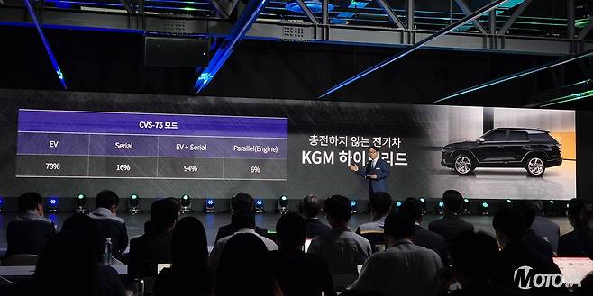 여기에 더해, KGM측은 향후 개발할 하이브리드 자동차의 개발 방향에 대해서도 설명했다. 발표자로 나선 KGM의 권용일 기술연구소장은 "KGM의 하이브리드 자동차는 내연기관 자동차가 아닌, 전기차에서부터 출발했다"며, "화재로부터의 불안감과 충전불편으로부터 자유롭고, 엔진의 구동개입을 최소화하며, 전기차와 유사한 주행성능을 경험할 수 있는, "충전하지 않는 전기차"를 모토로 개발하고 있다"고 설명했다. KGM은 이전에 출시한 '토레스 하이브리드'를 통해, 남다른 접근법의 하이브리드를 선보인 바 있다. KGM의 토레스 하이브리드 시스템은 엔진의 구동개입을 최소화 EV모드로 주행하는 구간을 극대화해 전기차와 유사한 주행환경을 제공하고, 연료 낭비를 최소화하려는 경향을 보이는데, 이는 처음부터 의도된 설계인 것이다.