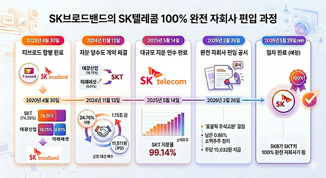 이번 조치는 수년에 걸친 지분 확보 작업의 최종 단계다. SKB는 2020년 4월30일 티브로드와 합병하며 SKT가 74.38%, 태광산업과 미래에셋이 각각 16.75%, 8.01%의 주요 주주로 참여한 바 있다. 이때 태광산업은 티브로드의 전 소유주였으며 미래에셋은 재무적 투자자(FI)였다.