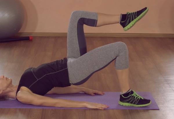 매트에 등을 대고 누운 상태에서 무릎을 세우고 발은 바닥에 고정합니다. 팔은 바닥을 누르며 엉덩이를 들어 올려 브릿지 자세를 만듭니다. 이 상태에서 오른쪽 다리를 공중으로 들었다가 내리고, 왼쪽 다리도 반복합니다.