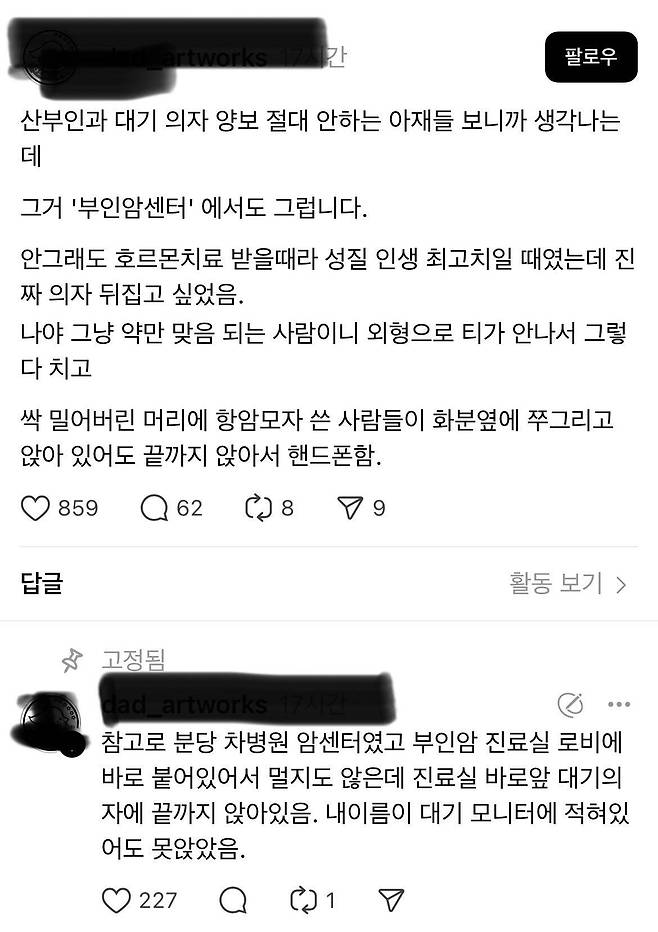 부인암센터에서도 대기실의자에 앉아있는 아재들