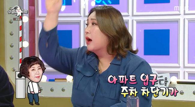 풍자는 "신기루 언니가 지금 좀 아프다. 목이 아파서 병원에 가야한다고 하더라. 감기인가보다 했는데 쇠몽둥이로 맞았다고 하더라. 알고봤더니 아파트 입구 차단기가 차로 인식해서 목을 맞았다. 미니SUV로 착오를 한 것 같다"라고 말해 주위를 폭소케 했다.