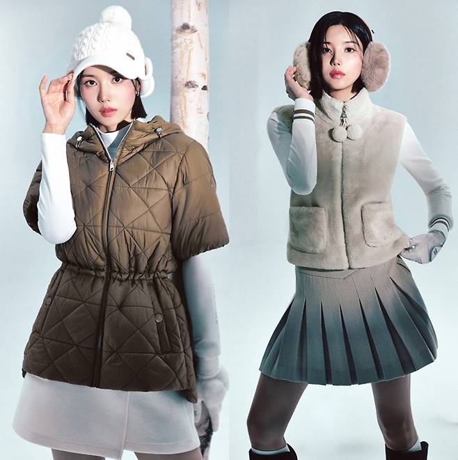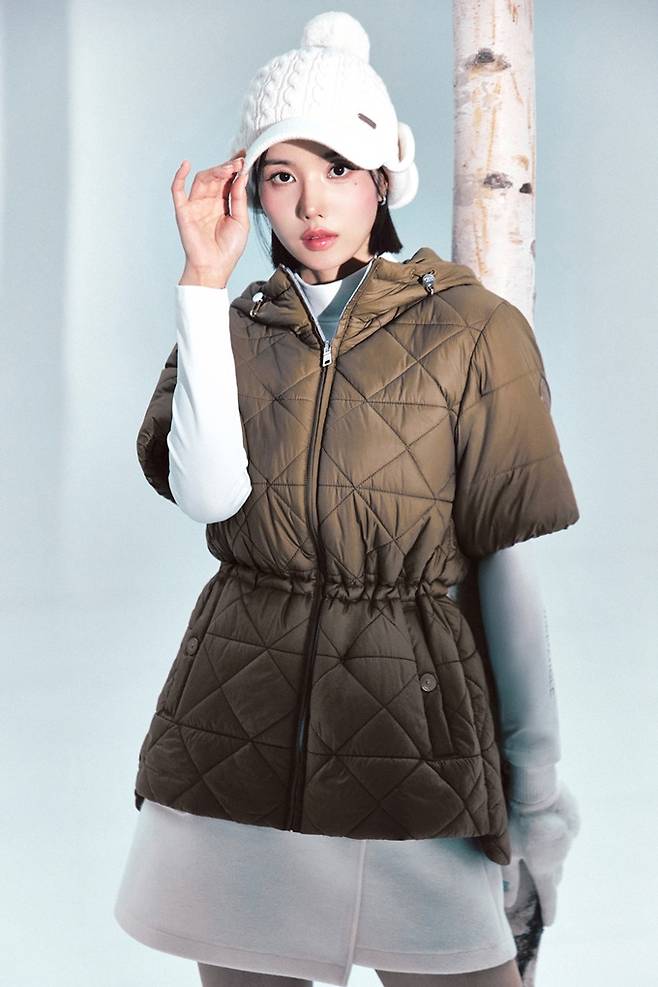 권은비는 시어링 믹스매치 반팔 다운을 착용해 포근한 양털 플리스와 은은한 펄감 소재가 어우러진 하이브리드 다운 스타일을 선보였다.