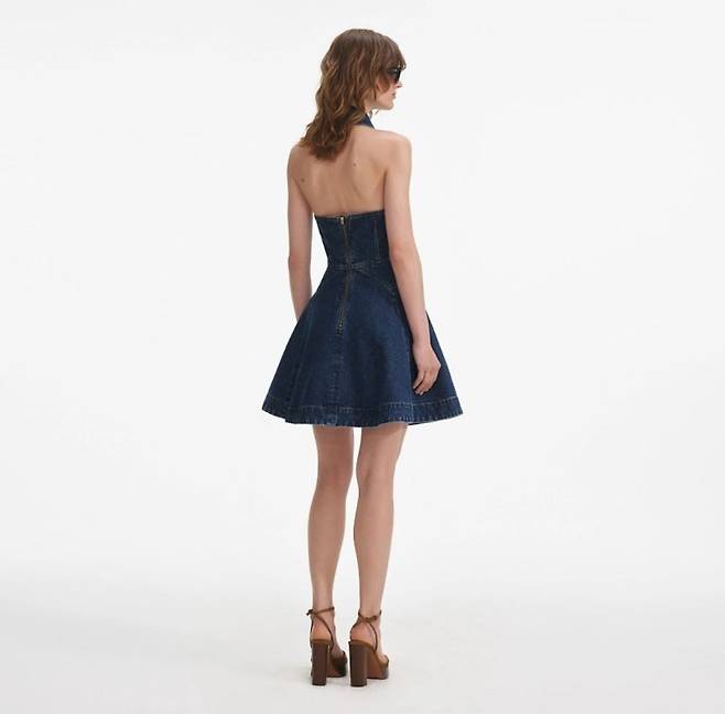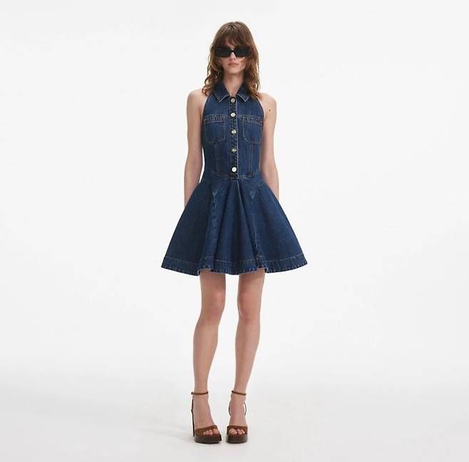 • 제품명 (Product Name): 데님 민소매 플레어 미니 드레스 (Denim Sleeveless Flare Mini Dress)