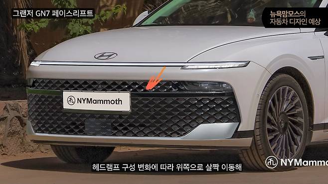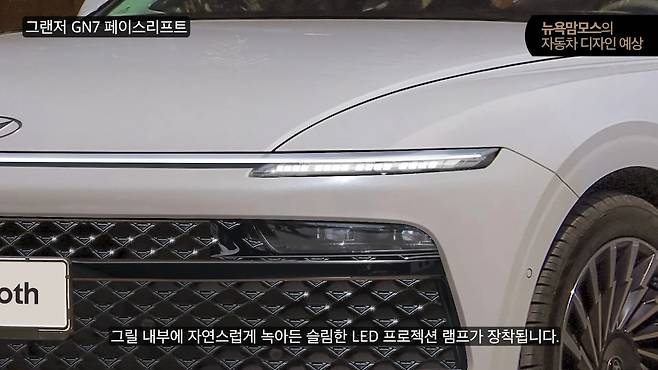 그랜저의 상징과도 같은 커다란 그릴 영역에서도 변화가 예상된다. 기존 사각형 헤드램프 박스가 제거되고, 그릴 내부에 자연스럽게 통합된 슬림한 LED 프로젝션 램프가 장착될 것으로 보인다. 이는 현대차가 최근 추구하는 '아트 오브 스틸(철의 예술)' 디자인 언어의 연장선상에 있으며, 기존 GN7, N74, 넥쏘 풀체인지 모델들과 유사한 디자인 흐름을 따를 것으로 예상된다.
