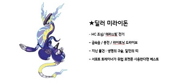 전기 타입 딜러로 바이올렛 타이틀 포켓몬인 '미라이돈'을 추천한다. 전기, 드래곤 타입으로 풀과 비행 타입 대미지를 반감하기 때문에 체력관리가 쉽다. 랭크 다운과 랭크 업 기술을 자력으로 사용할 수 있어 솔로 플레이에 적합하다.
