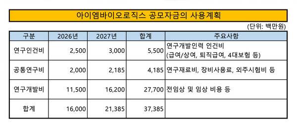 공모자금 373억9000만원은 전액 운영자금으로 사용될 예정이다. 구체적으로는 2026~2027년 연구인건비 55억원, 공통연구비 41억9000만원, 연구개발비 277억원 등에 배분된다. 특히 회사가 개발 중인 후속 파이프라인 IMB-201과 IMB-402의 화학·제조·품질 공정관리(CMC), 전임상, 임상 비용이 대부분을 차지한다.