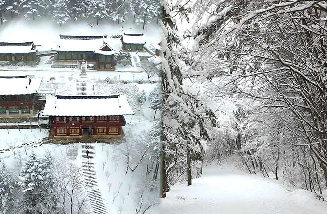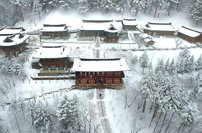 사찰 건물의 고즈넉한 기와 위에 눈이 소복하게 앉아 있는 모습은 겨울이 아니면 결코 볼 수 없는 장면이다.