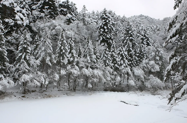 눈이 내린 직후 숲으로 들어서면 특유의 청량한 침엽수 향이 진하게 퍼지고, 전나무 가지에 쌓인 눈이 바람결에 따라 조용히 흔들린다. 먼발치에서 들려오는 물 흐르는 소리, 발밑에서 뽀드득 울리는 눈의 감촉까지 이 숲은 오감을 모두 깨운다.
