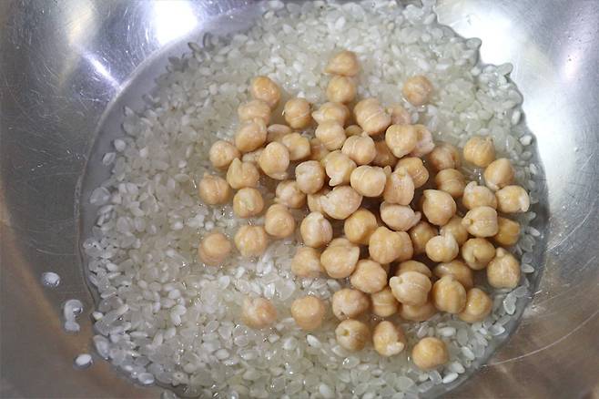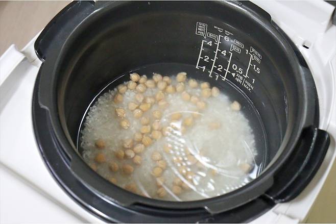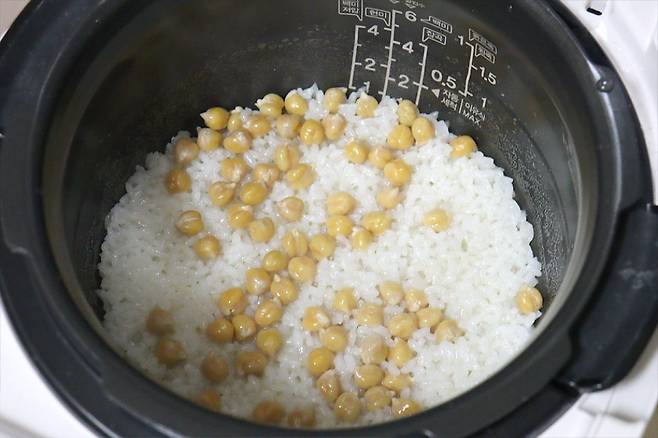 쌀을 씻고 물을 맞춘 다음, 불려둔 병아리콩을 함께 넣어주세요.콩이 물을 흡수하기 때문에 평소보다 물을 약간 더 넣어주세요.