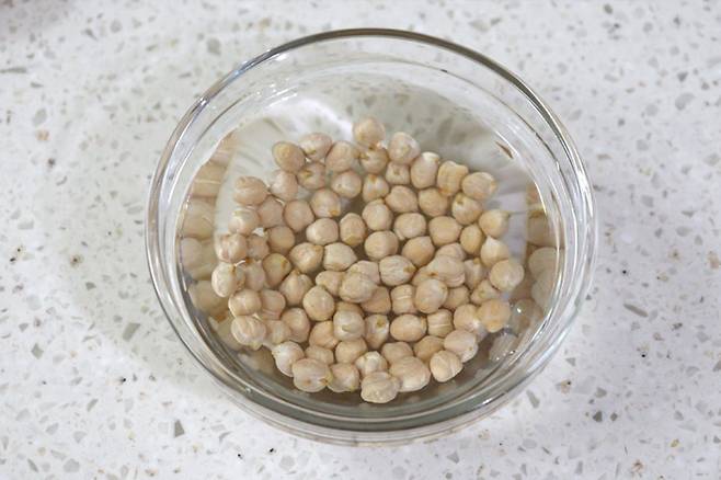 병아리콩은 물에 6시간~8시간 정도 불려주세요. 밤에 불려두면 아침에 바로 밥을 지을 수 있어 편리해요.
