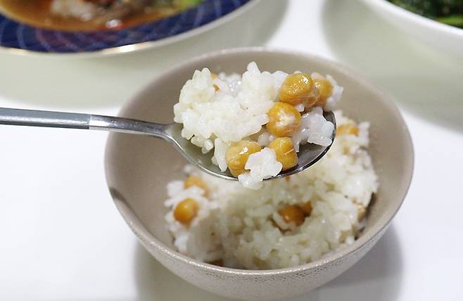 병아리콩밥은 단독으로 먹어도 고소하고 맛있지만, 나물 반찬이나 저염 김치, 구운 생선과 함께 먹으면 더 좋아요.