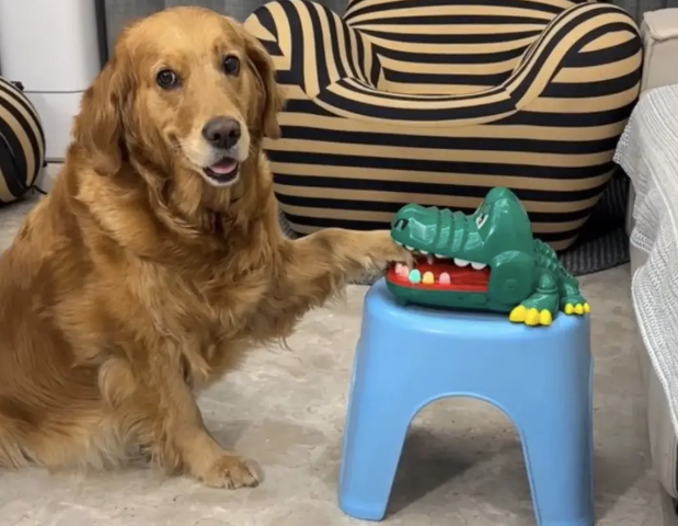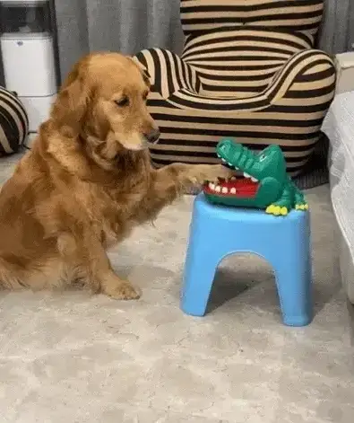 커다란 골든 리트리버 강아지가 작은 악어 장난감을 처음 가지고 노는 모습이 정말 사랑스럽습니다.