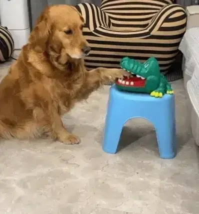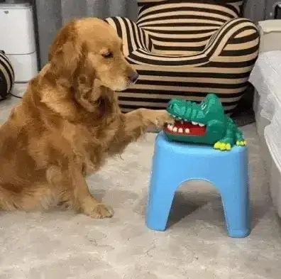 커다란 골든 리트리버 강아지가 작은 악어 장난감을 처음 가지고 노는 모습이 정말 사랑스럽습니다.