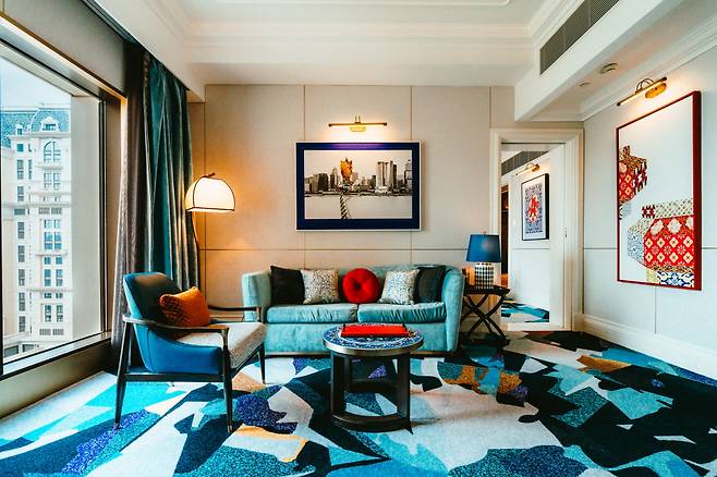 객실 얘기를 해 보자면, 일단 규모가 어마어마하다. 무려 1,350개. 로비가 동쪽과 서쪽, 2개씩 위치해 있는 이유가 다 있다. 객실은 마카오의 독특한 문화적 정체성과 해양 역사를 기념하는 동서양의 미학으로 꾸며져 있다. 가구는 마카오의 유산에서 영감을 받은 패턴과 모티프를 목재, 도자기, 청동 금속 악센트로 재해석했고, 옛 마카오와 새 마카오를 묘사한 예술 작품도 틈틈이 찾아볼 수 있다.