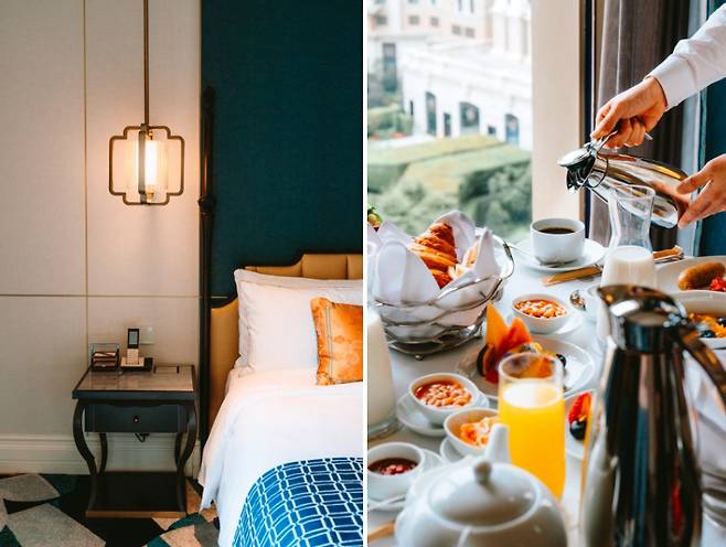 룸 타입은 총 7가지. 이 중 특히 추천하고 싶은 타입은 정원 전망의 '주니어 스위트(Junior Suite)'다. 마카오의 문화적 역사는 바닥부터 조명까지 이어지는 정교한 선과 패턴, 전통 직물 등에서 물씬 느껴진다. 80㎡의 거실과 킹사이즈 침대가 놓인 침실은 널찍널찍해 개방감이 상당하다. 통창 너머로 리스보아의 상징적인 장소인 '자르딤 세크레토(Jardim Secreto)'를 한눈에 내려다볼 수 있다는 건 또 다른 장점이다. 조식으로 인 룸 다이닝을 신청하면 아침 햇빛에 반짝이는 정원 뷰를 보며 객실에서 식사를 즐길 수도 있다. 강력 추천.