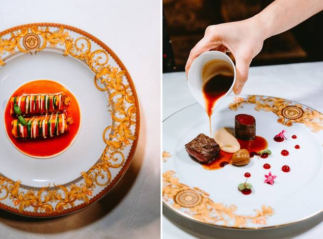 팔라조 베르사체 호텔에 위치한 만큼 레스토랑의 전체 인테리어 역시 베르사체를 기반으로 디자인됐다. 이탈리아 대리석으로 만들어진 장미꽃부터 이탈리아 장인이 직접 제작한 바닥, 베르사체 식기, 와인잔 등에 이르기까지, 시종일관 베르사체만의 고풍스러움이 계속된다.