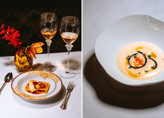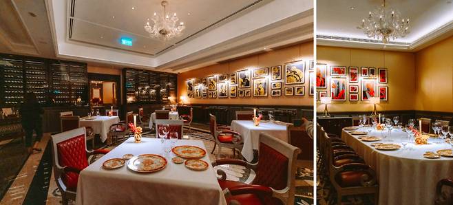 팔라조 베르사체 호텔에 위치한 만큼 레스토랑의 전체 인테리어 역시 베르사체를 기반으로 디자인됐다. 이탈리아 대리석으로 만들어진 장미꽃부터 이탈리아 장인이 직접 제작한 바닥, 베르사체 식기, 와인잔 등에 이르기까지, 시종일관 베르사체만의 고풍스러움이 계속된다.