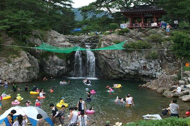 오래된 소나무 숲에 둘러싸인 채로 내려오는 폭포는 보기만 해도 절경이라 물놀이를 즐기면서 풍경을 올려다 보기 좋다.