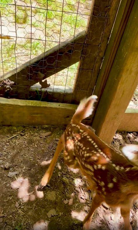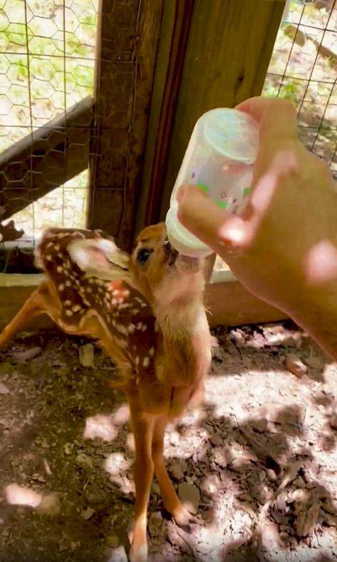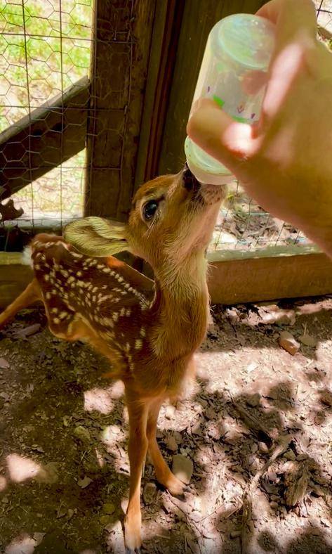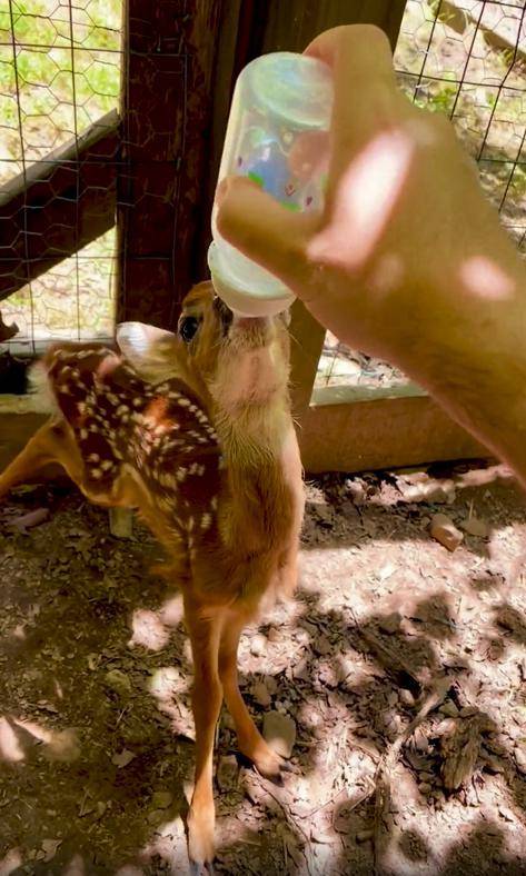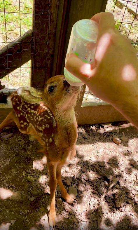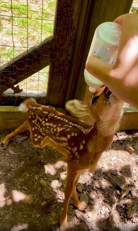 한 사람이 조심스럽게 젖병을 들고 있습니다. 그 앞에는 아직 다리에 힘이 다 붙지 않은 듯 가냘픈 새끼 사슴 한 마리가 있습니다.
