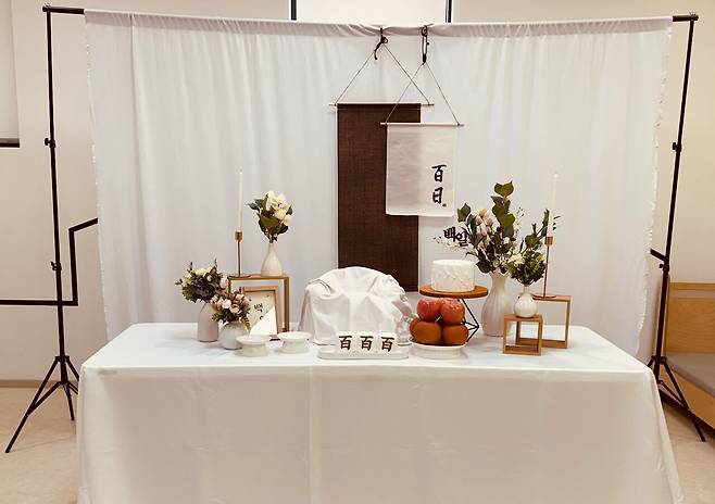 백일과 돌 상차림 세트와 배경 천, 아기를 눕힐 수 있는 러그, 삼각대, 우드 토퍼 같은 촬영 소품이 마련된 장소를 빌릴 수 있는 서비스다.
