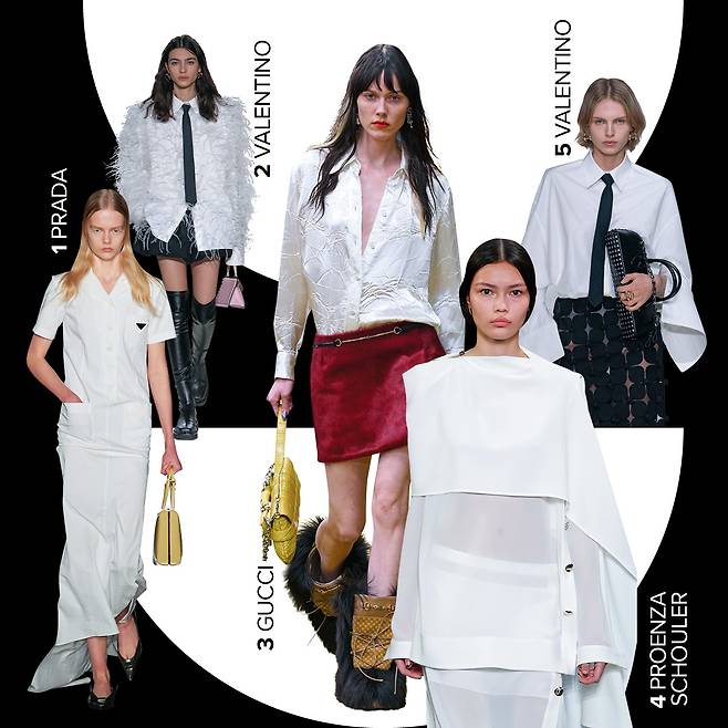 5 거의 모든 룩에 화이트 셔츠와 타이 룩이 등장한 발렌티노의 쿠튀르 쇼. 클래식한 아이템에 크고 넓은 슬리브와 커프스, 매서운 아이라인과 페이스 피어싱, 볼드한 액세서리를 매치해 세련된 애티튜드를 완성했다.