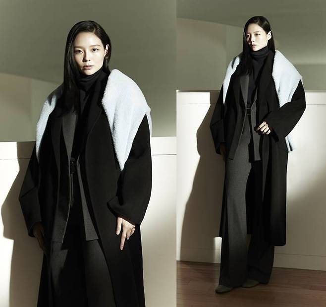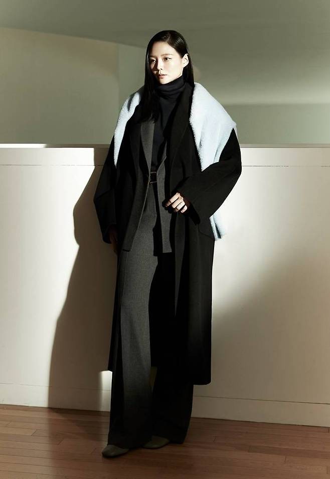이솜은 그레이 수트 위에 블랙 핸드메이트 코트와 니트를 어깨에 걸친 숄더 로빙룩으로 멋스러움을 더했다.