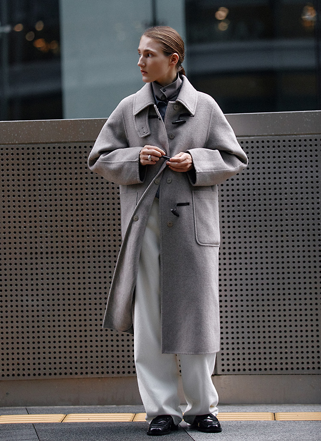핸드메이드 코트는 자연스러운 루즈핏과 심플한 디자인이 고급스러워 보인다.