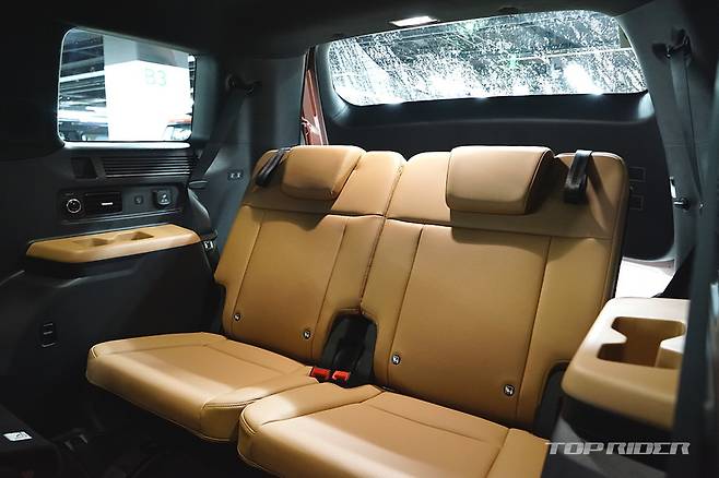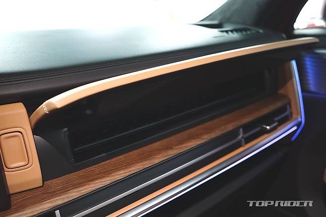 실내 고급감은 아주 인상적인데, 대시보드 상단과 도어패널의 가죽스타일 마감과 오픈포어 스타일의 우드 인레이, 헤어라인이 포함된 금속 장식은 플라스틱 성형체라고 생각되지 않을만큼 완성도가 높다. 대시보드의 디자인과 디테일, 고급감은 오히려 제네시스를 앞선다.