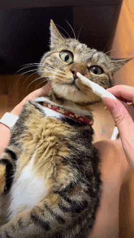 어느 고양이는 집사가 면봉으로 콧물을 닦기 시작하자 마치 뇌가 텅 빈 듯한 표정을 짓습니다.