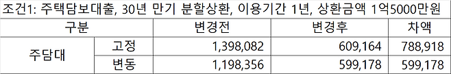 그러나 향후엔 60만9164원만 지불하면 된다. 78만8918원을 절약할 수 있게 된 것이다. 변동 금리로 받은 경우엔 변경 전엔 119만8356원을 내던 것을 변경 후엔 59만9178원만 부담하면 된다. 약 60만원을 아끼게 되는 것이다.