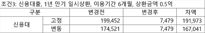 1년 만기 일시상환 상품을 6개월 이용 후에 5000만원을 갚는다고 가정해보자. 고정 이율 상품을 이용하는 소비자는 제도 변경 전엔 19만9452원을 냈으나, 변경 후엔 7479원만 지불하면 된다. 변동 이율 상품 이용 고객은 제도 변경 전 17만4521원을 내던 것을 향후엔 7479원만 지불하면 된다.