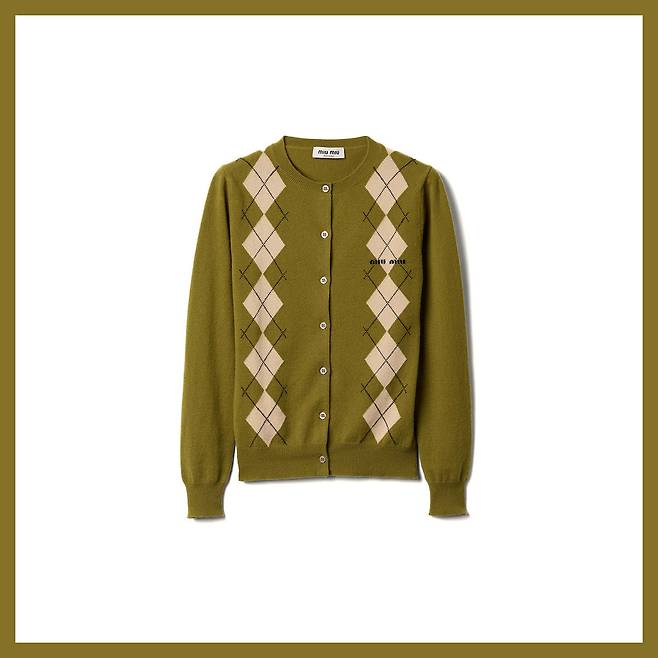 볼드한 아가일 패턴이 어렸을 적 향수를 불러일으키는 미우미우의 캐시미어 카디건. 군더더기 없는 실루엣과 유행에 구애받지 않는 패턴, 앙증맞은 타이포 로고 장식은 소장 가치를 높여줍니다. 올리브그린 컬러를 선택해 가을의 분위기를 한층 배가해 주죠. 발목까지 내려오는 길이의 A 라인 스커트나 데님 팬츠 등 어떤 아이템과도 두루 잘 어울려 높은 활용도를 자랑합니다.