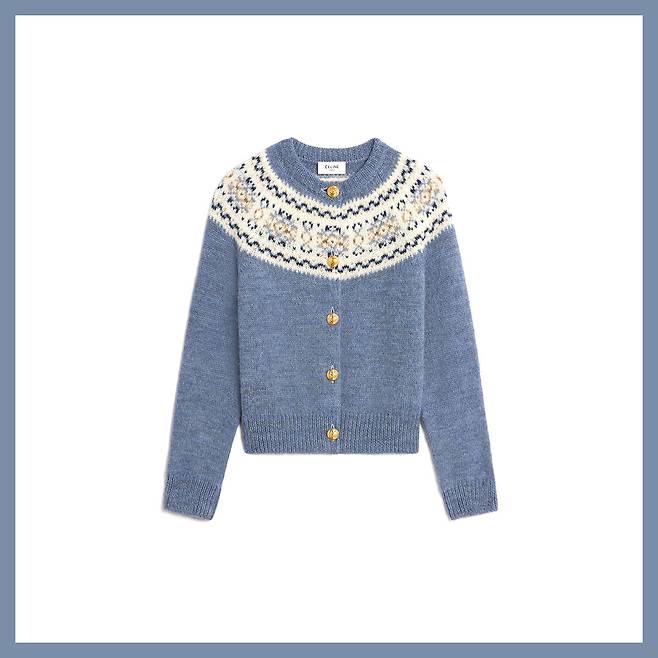 보다 특별한 디자인의 카디건을 찾고 있다면 셀린느의 울 카디건을 눈여겨보세요. 사랑스러운 라이트 블루와 기하학적 패턴이 조화를 이뤄 마치 동화 속 주인공이 입고 있는 카디건을 연상시키는데요. 보는 것만으로도 포근함을 선사하는 이 카디건과 함께 감각적인 스타일을 완성해 보시길.