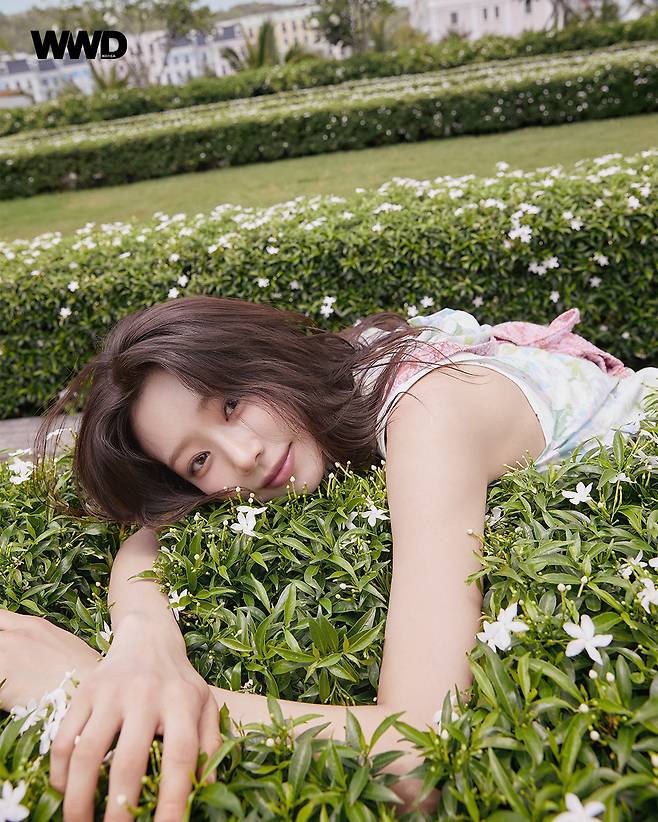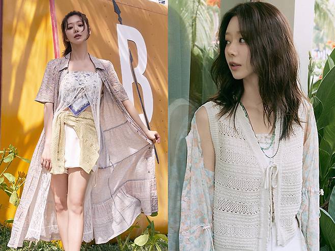 잔잔하고 은은한 무늬의 의상들은 자연과 어우러져 사랑스러운 룩을 완성하고 있다. 특히 여름의 대표적인 패션 아이템 중 하나인 크로셰 니트를 포인트로 매치했다.