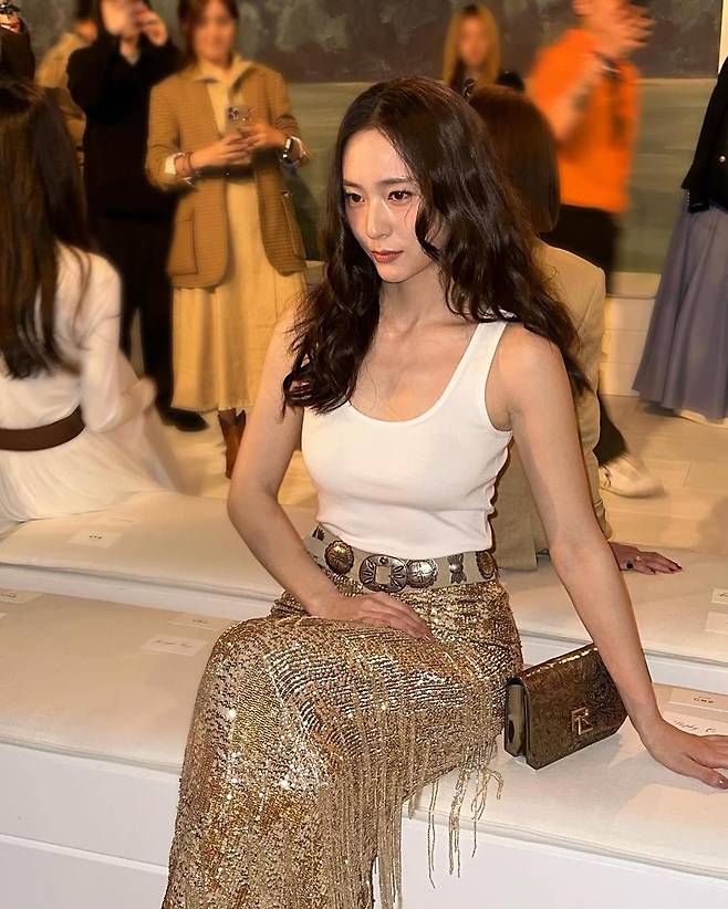 공개된 사진 속 정수정은 랄프 로렌의 2025 스프링 리씨 패션 익스피리언스를 위해 상하이를 찾았다. 조명이 비추는 화이트 월 앞에 선 그녀는 화려한 골드 스팽글 스커트를 입고 있다. 허리를 강조한 메탈릭 벨트와 함께 매치된 순백의 슬리브리스 탑은 심플하면서도 강렬하다. 지나치지 않은 미니멀리즘, 하지만 시선을 뗄 수 없는 스타일.